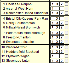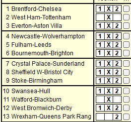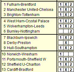 Ser ut att bli en bra slant att spela för, sen får vi se vilka singlar vi tar, ev något kryss blandat med hemma/borta vinst. Men skräll/icke favoriter blir det, dvs vi garderar upp stora favoriter fullt ut och hoppas på skräll där och utdelning från runt miljonen ...